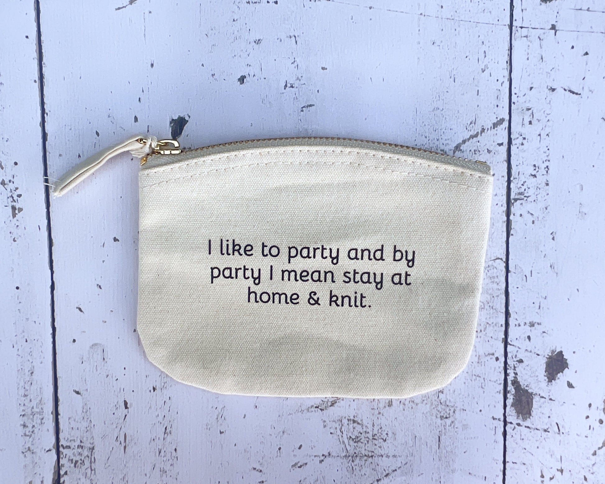 Small notions bag with print "I like to party and by party I mean stay at home & knit".